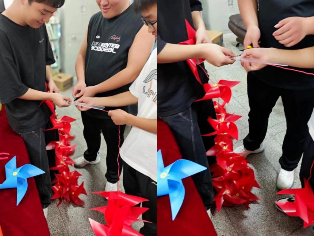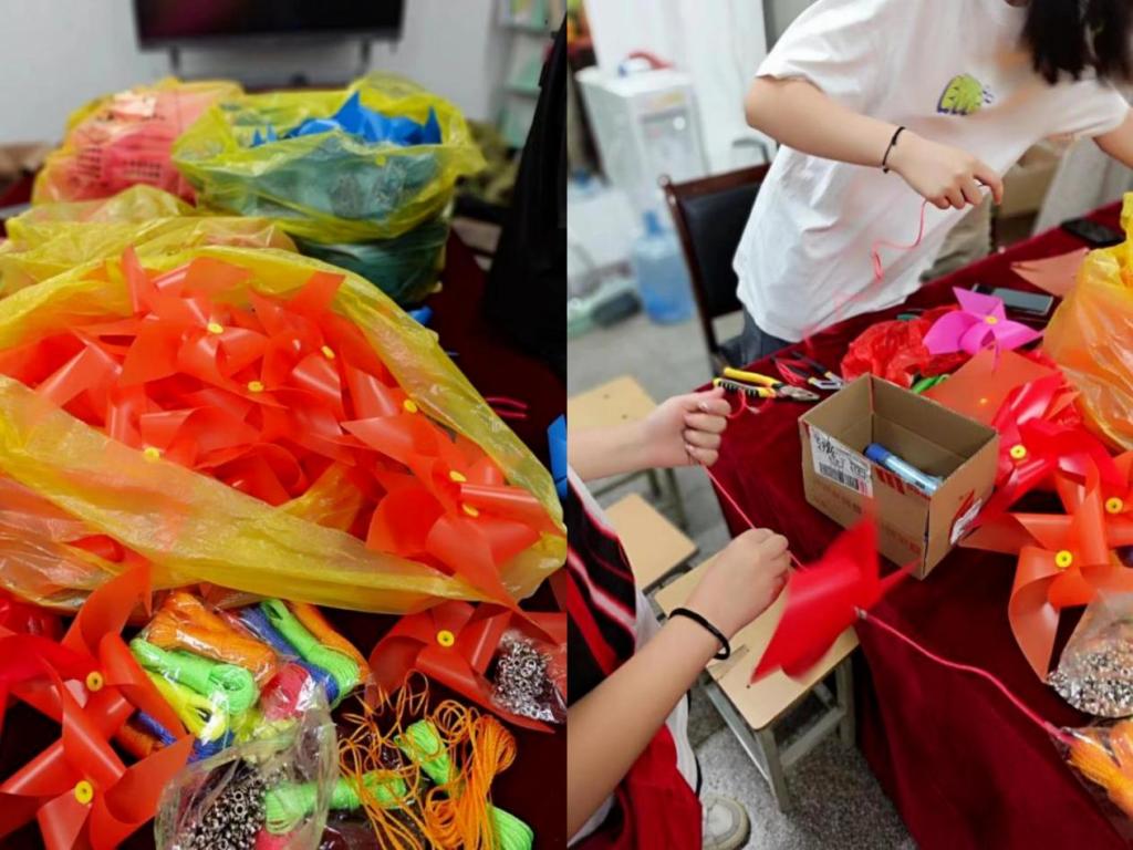 学长学姐们聚集在一起,用心折叠小风车,全力以赴迎接新生,传递着对学弟学妹满满的爱与关怀。