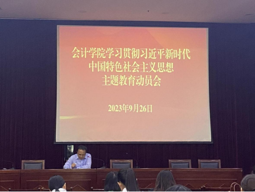 为深入学习贯彻习近平总书记关于主题教育系列重要讲话精神和重要指示批示精神,落实学校主题教育工作会议要求,9月26日下午,会计学院全体教职工在六楼会议室参加学习贯彻习近平新时代中国特色社会主义思想主题教育动员动员大会。