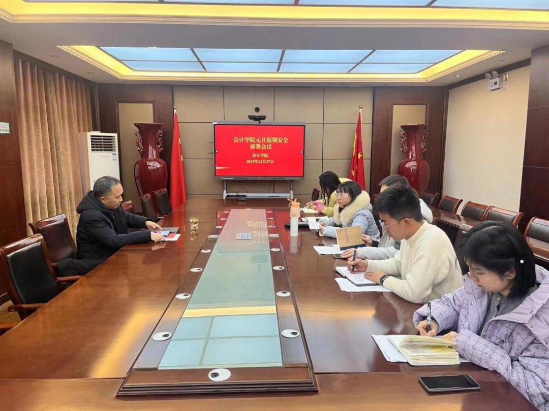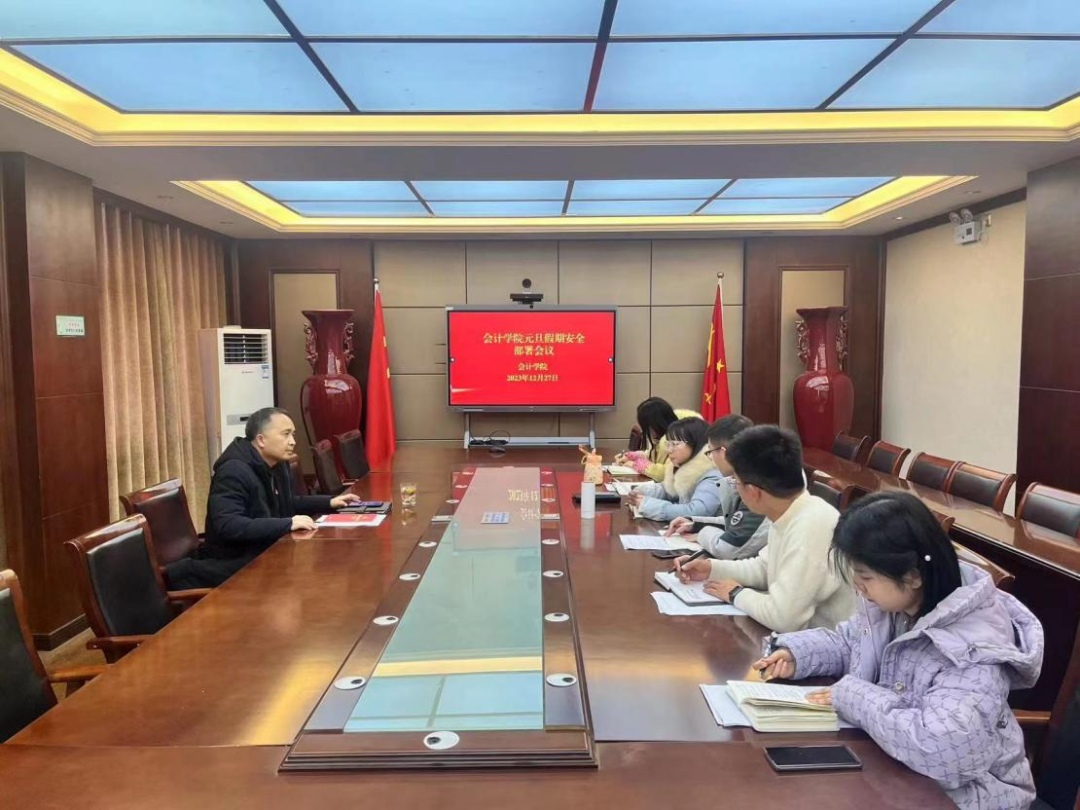 12 月 27 日,会计学院召开了元旦假期安全部署会议,党总支书记宫凯就会计学院元旦假期安全做出重要部署,学工办主任刘智莉、团总支书记王希冉以及全体辅导员参加了会议。