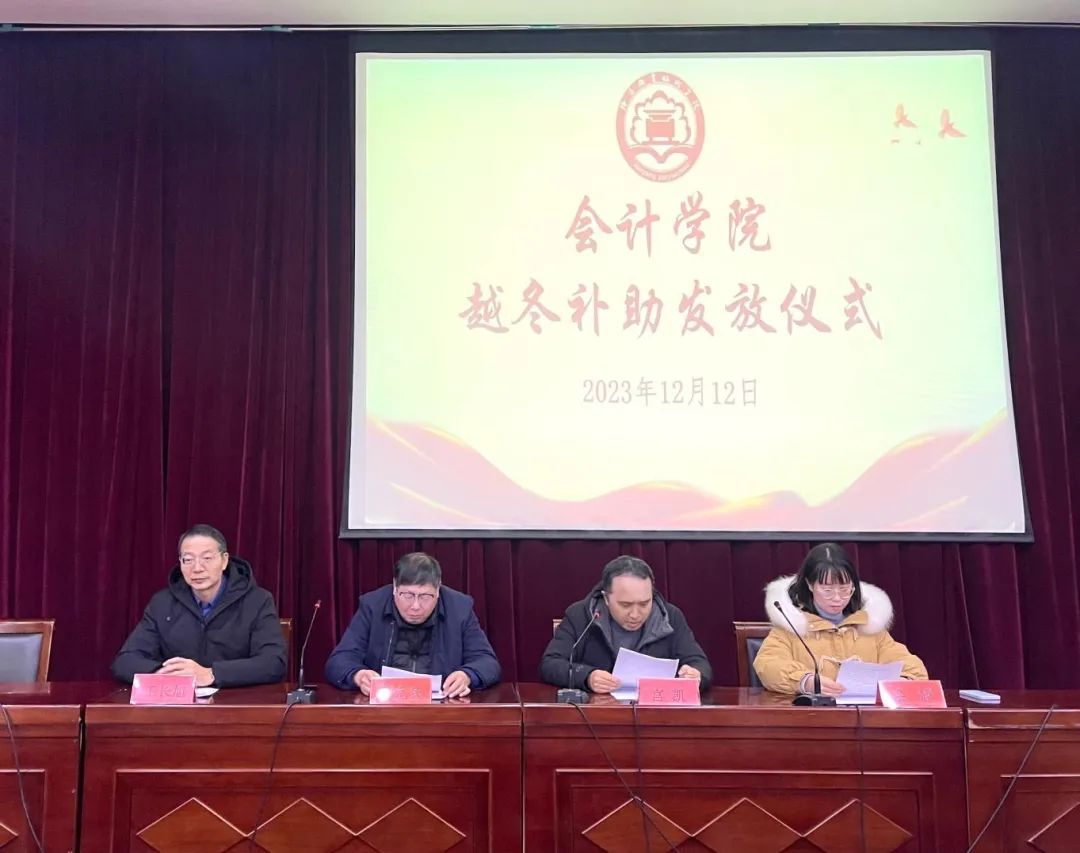 真情系学子,温暖御寒冬。12月12日下午,会计学院越冬补助物资发放仪式在六楼会议室举行,活动由会计学院党总支书记宫凯主持。参加本次活动的领导有洛阳职业技术学院党委委员、副校长韦元民、会计学院党总支书记宫凯、院长王长旭、学生办公室主任刘智莉。