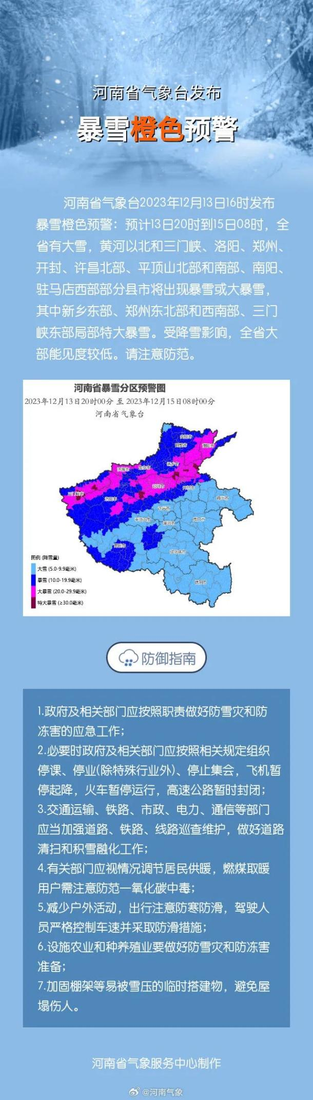 河南省气象台12月13日16时发布暴雪橙色预警:预计13日20时到15日08时,全省有大雪,黄河以北和三门峡、洛阳、郑州、开封、许昌北部、平顶山北部和南部、南阳、驻马店西部部分县市将出现暴雪或大暴雪,其中新乡东部、郑州东北部和西南部、三门峡东部局部特大暴雪。受降雪影响,全省大部能见度较低。请注意防范。