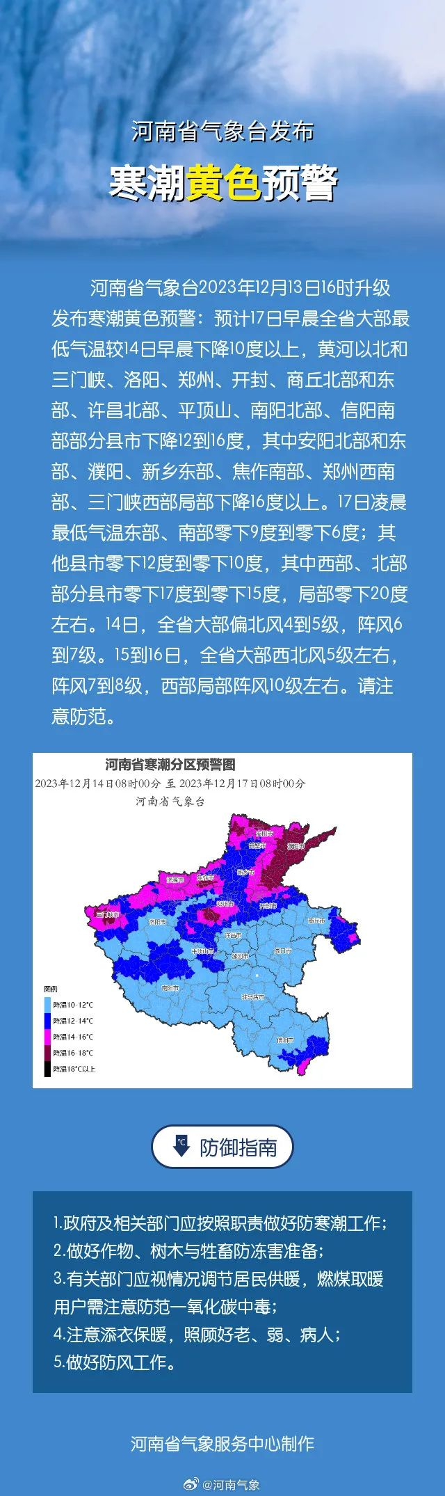 同时,河南气象台发布了寒潮黄色预警,大风蓝色预警,道路结冰黄色预警。