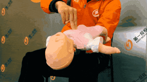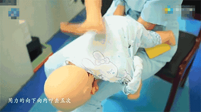 压胸:把宝宝翻正,在胸部正中靠下部位,用食指和中指按压5次