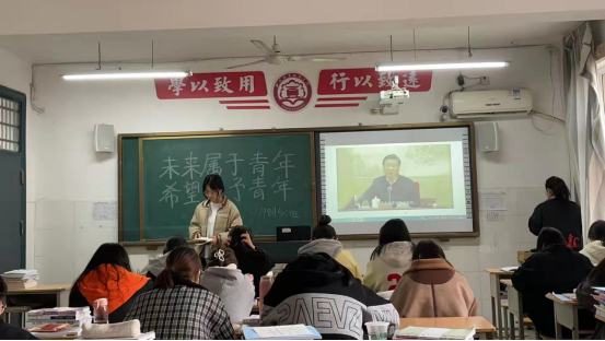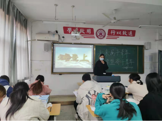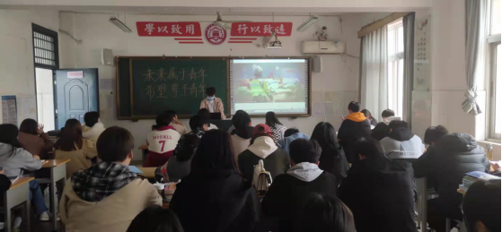 各班团支书为同学们播放各类影视视频,同学们认真观看,深入思考。回顾历史,老一辈革命者怀揣救国理想,乘风破浪,创建了中国共产党。如今,中华民族向世人展现了欣欣向荣的气象,我们正以不可阻挡的步伐迈向伟大复兴的道路,这都是我们青年一代的担当。