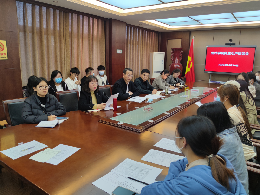 为切实保障疫情防控期间学生校园生活的安全与稳定,切实解决涉及到学生利益的各项热点问题,会计学院于10月10日在三楼会议室召开了师生心声座谈会,与学生代表进行面对面交流。会计学院院长王长旭、副书记任国华、相关学生工作人员及学生代表参加了此次会议。
