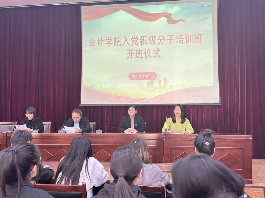 2024年4月7日中午,会计学院入党积极分子培训班开班仪式在西工校区六楼会议室举行。学院党总支书记宫凯、党总支副书记梁静、学生党支部书记刘智莉、组织纪检委员王希冉、辅导员滕帅及54名入党积极分子参加了开班仪式。