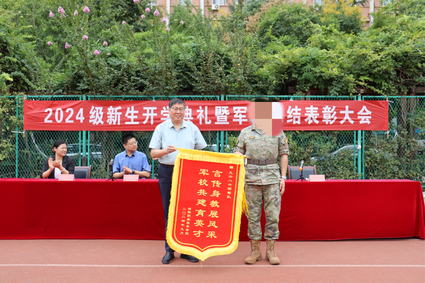 韦元民向承训部队赠送锦旗,以表达对承训部队在军训期间辛勤付出的感谢,确保军训的顺利进行,圆满完成了新生的军训任务。