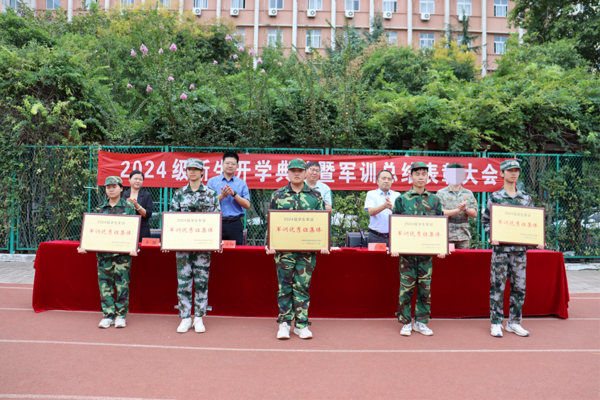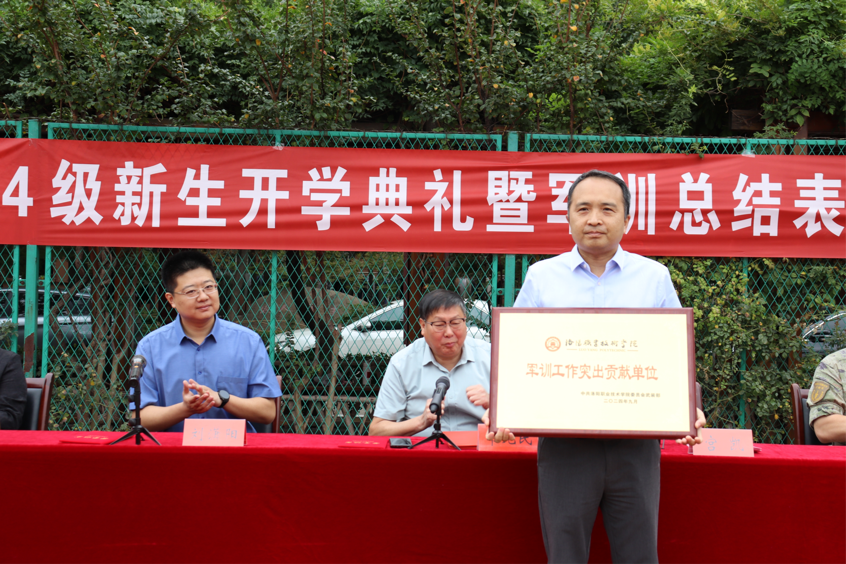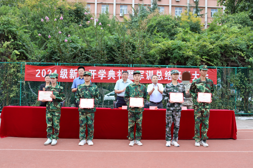韦元民宣读会计学院荣获军训工作突出贡献单位的决定,承训部队负责人宣读关于表彰2024级学生军训先进连队、优秀班集体、优秀学员的决定,接着校领导为获得表彰的单位、集体和个人进行颁奖。