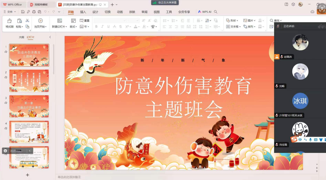 春节假期将至,为帮助广大青少年提升自护意识和能力,度过一个安全健康、温暖祥和的快乐假期,根据团省委、团市委和校团委的安排部署,在1月至2月集中开展“12355青春自护平安春节”专项活动。会计学院团总支组织部于2024年1月30日组织开展了线上“防意外伤害教育”主题班会。本次班会由各班团支书主持,辅导员参与,班级全体学生认真听取会议内容。