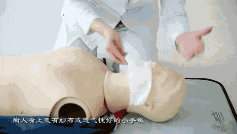 注意一只手将患者额头下压,一只手将下巴上抬,以开放气道。