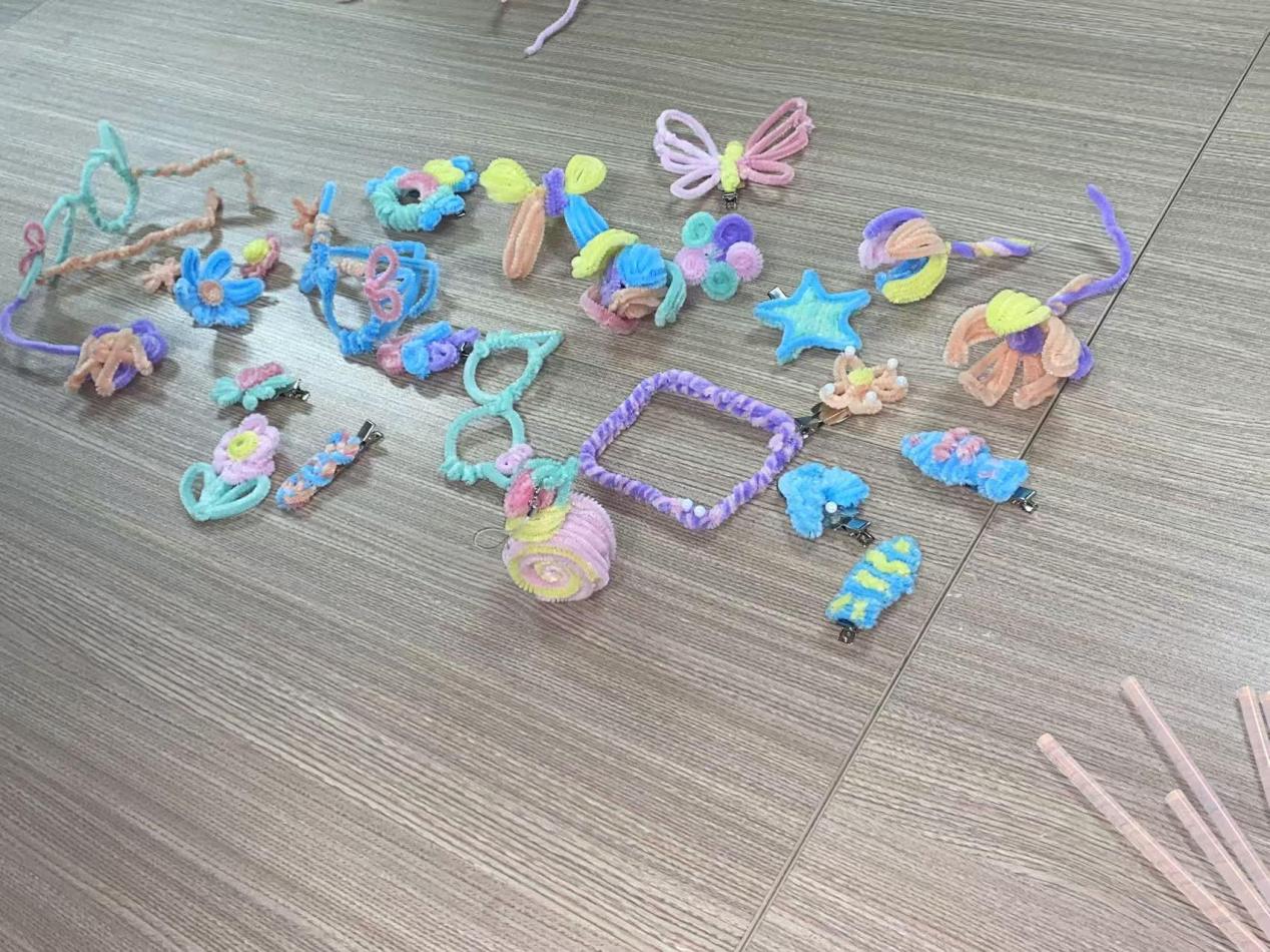 活动中,同学们在非遗文创中心工作人员的带领下,通过扭扭棒的制作学习步奏,创作出了各种造型独特、色彩丰富的手工作品。