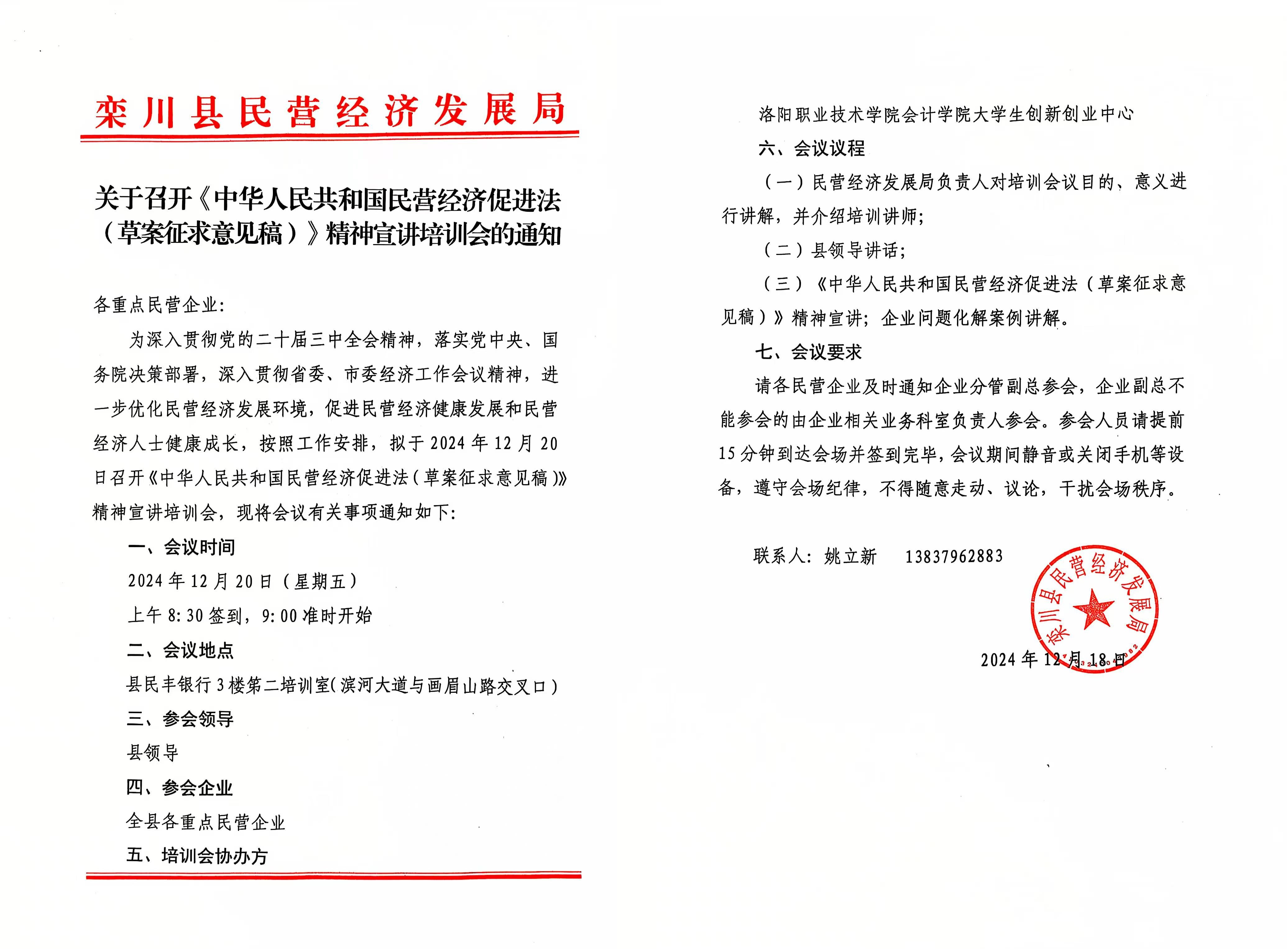 2024年12月20日,受栾川县政府相邀,大学生创新创业中心负责人刘鹏、会计学院教授刘娜娜、及大创中心部分优秀学生共赴栾川开展培训会。此次培训会,栾川县40家重点民营企业的代表参加。通过第一期民营企业大讲堂帮助企业解决实际问题,使企业了解政策要求,增强对各行业经济发展的认知,促进民营企业家深度领会中华人民共和国民营经济促进法草案的精神。