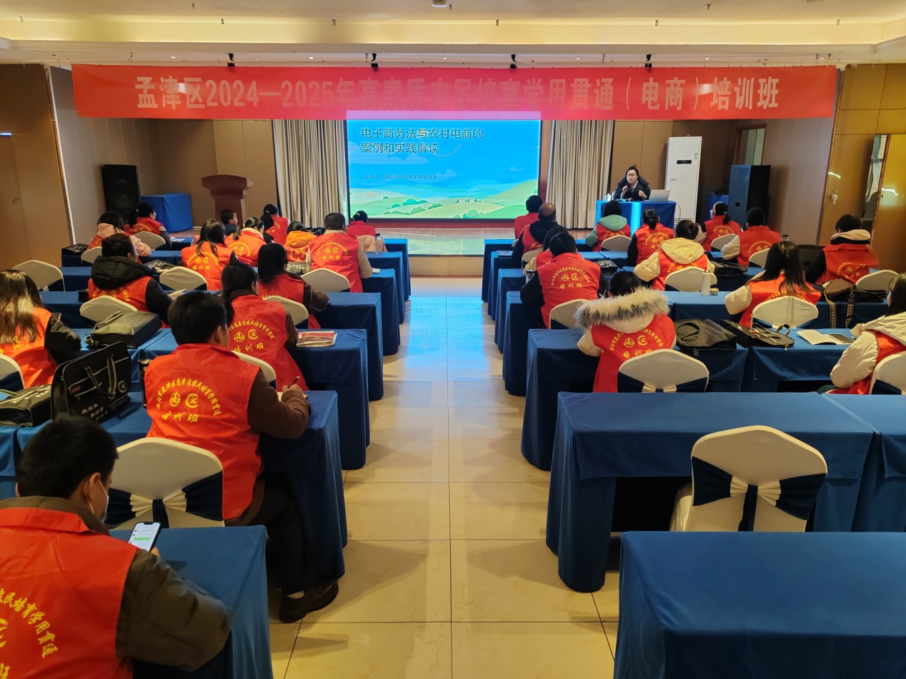 2024年12月28日,会计学院大学生创新创业中心负责人刘鹏与电商物流学院网络营销教研室主任刘庭玉,以及大创中心部分优秀学生,在孟津区开展高素质农民电子商务培育《中华人民共和国电子商务法》宣讲会。