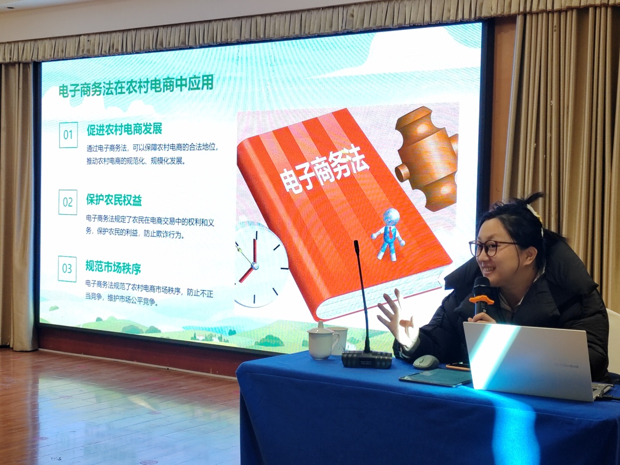 其次,刘庭玉主任对电子商务法进行了解读。详细讲解了农村电商发展路程和电子商务法视角下农村电商风险防范措施,进一步加强了农民对电子商务法的认知和参与度。