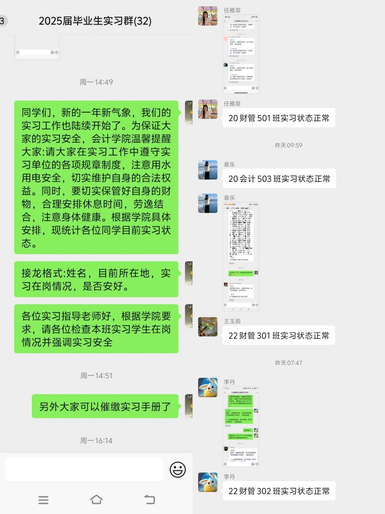 为深入贯彻 “以人为本” 的教育理念,及时把握 2022 级实习学生的工作、生活和学习状态,全方位洞悉学生在实习期间的思想动态,进一步强化实习安全管理工作,会计学院于 2 月 17 日至 19 日组织开展了新学期首次实习安全工作检查活动。