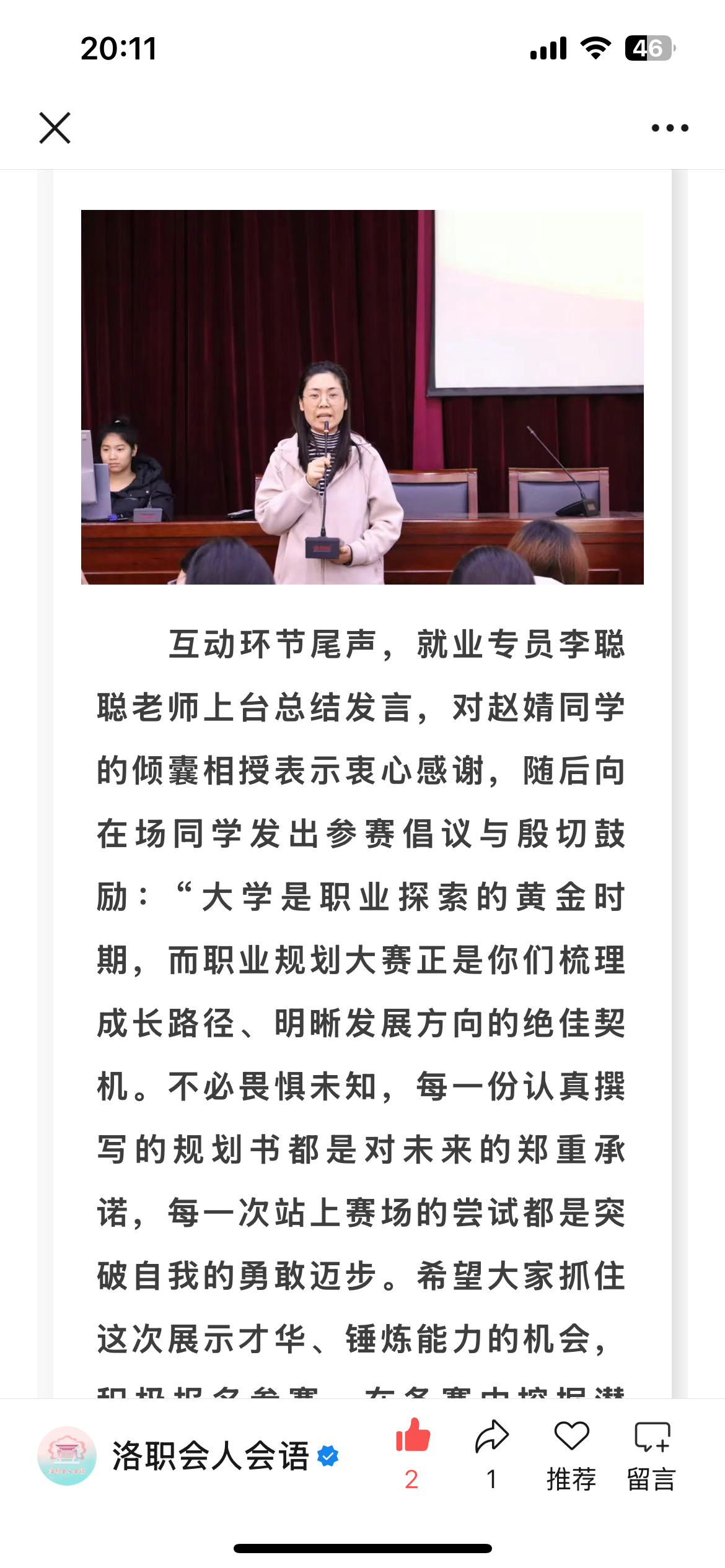互动环节尾声,社团负责老师李聪聪老师上台总结发言,对赵婧同学的倾囊相授表示衷心感谢,随后向在场同学发出参赛倡议与殷切鼓励:“大学是职业探索的黄金时期,而职业规划大赛正是你们梳理成长路径、明晰发展方向的绝佳契机。不必畏惧未知,每一份认真撰写的规划书都是对未来的郑重承诺,每一次站上赛场的尝试都是突破自我的勇敢迈步。希望大家抓住这次展示才华、锤炼能力的机会,积极报名参赛,在备赛中挖掘潜力、在竞争中收获成长,让青春在追逐梦想的道路上留下坚实足迹,用清晰的规划照亮未来职业征程!”