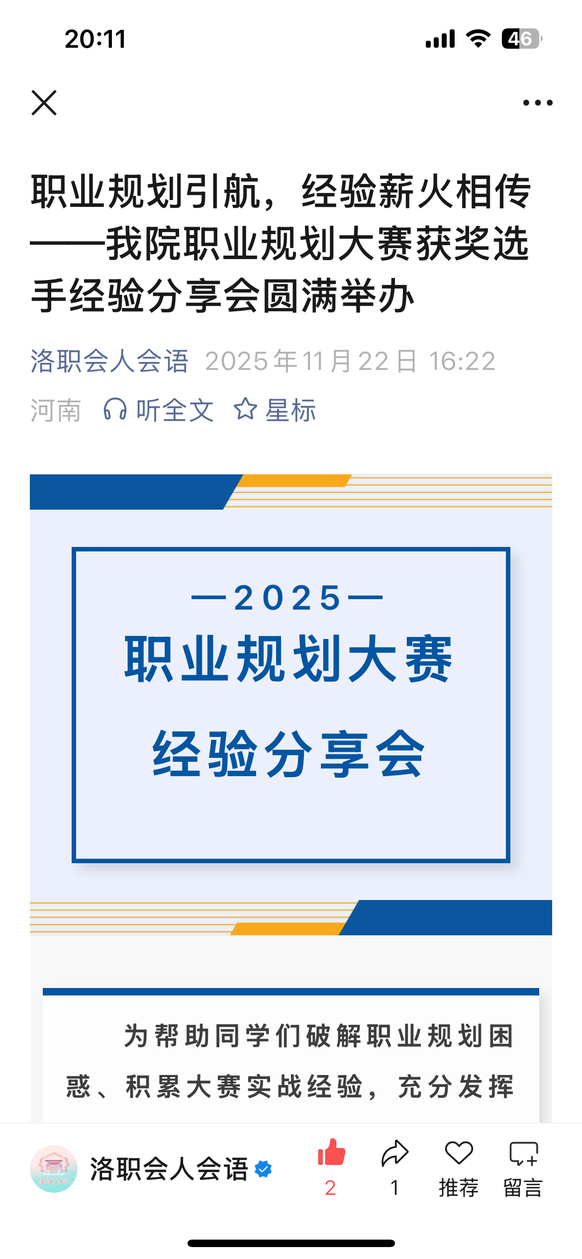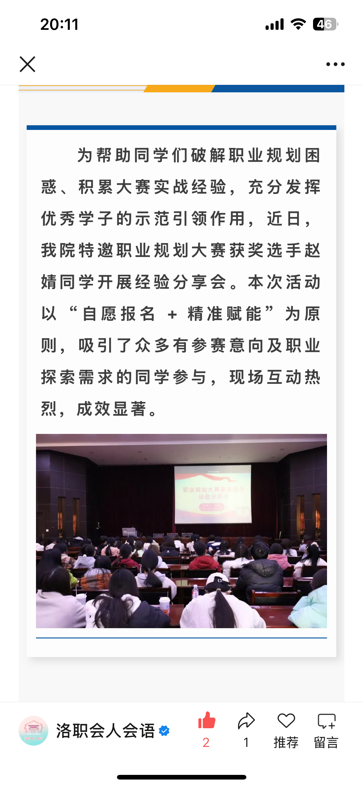 此次经验分享会的成功举办,不仅搭建了优秀学子与同学们的交流桥梁,更将职业规划大赛的育人价值延伸拓展。通过 “经验分享 +互动答疑 +老师寄语” 的形式,既为有需求的同学提供了精准指导,也进一步点燃了大家的参赛热情,营造了全院上下积极探索职业发展的良好氛围。未来,就业社团将持续开展此类赋能活动,为同学们的职业规划之路保驾护航,助力大家在人生赛道上稳步前行,绽放青春光彩。