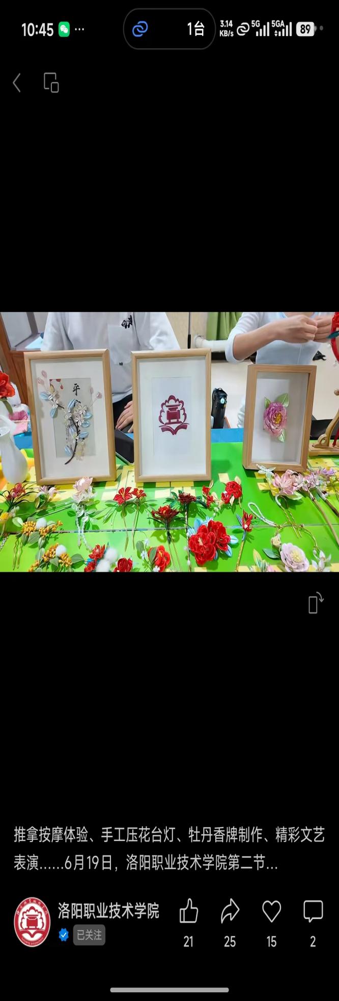 活动中的“非遗匠市·青春共赴”创意市集成为一大亮点。社团积极参与其中,与全校学子共同打造了一场兼具文化底蕴与青春活力的盛宴。市集上,学生自主设计制作的手工艺品融入丰富洛职元素,涵盖非遗缠花等多种品类,尽显创意与匠心。